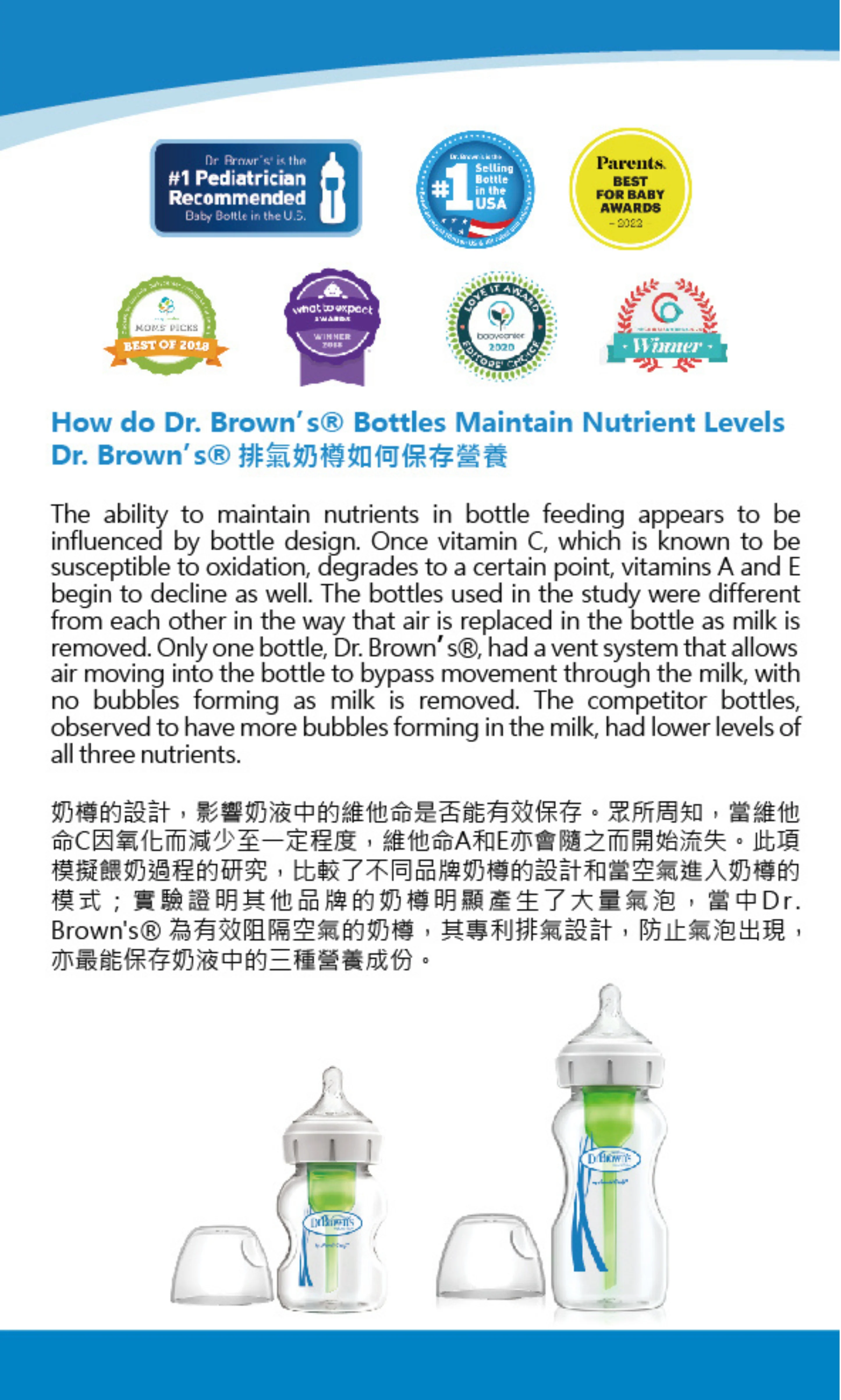美置銷量第一的奶樽品牌榮獲最多兒科醫生推薦實驗證明有效減低肚風、嘔奶、脹氣及肚絞痛全新仿母乳型奶咀,維持最自然而正確的吸吮,防止出現乳頭混淆活動式排氣管設計,父母可自由選擇安裝或移除排氣管,更輕鬆方便有效保存奶液重要營養,包括維他命 C、A 和 E100% 防止真空形成,避免寶寶肚子內積聚肚風可置於洗碗碟機頂層及蒸氣消毒煲不含雙酚 A,採用高級玻璃材料製造