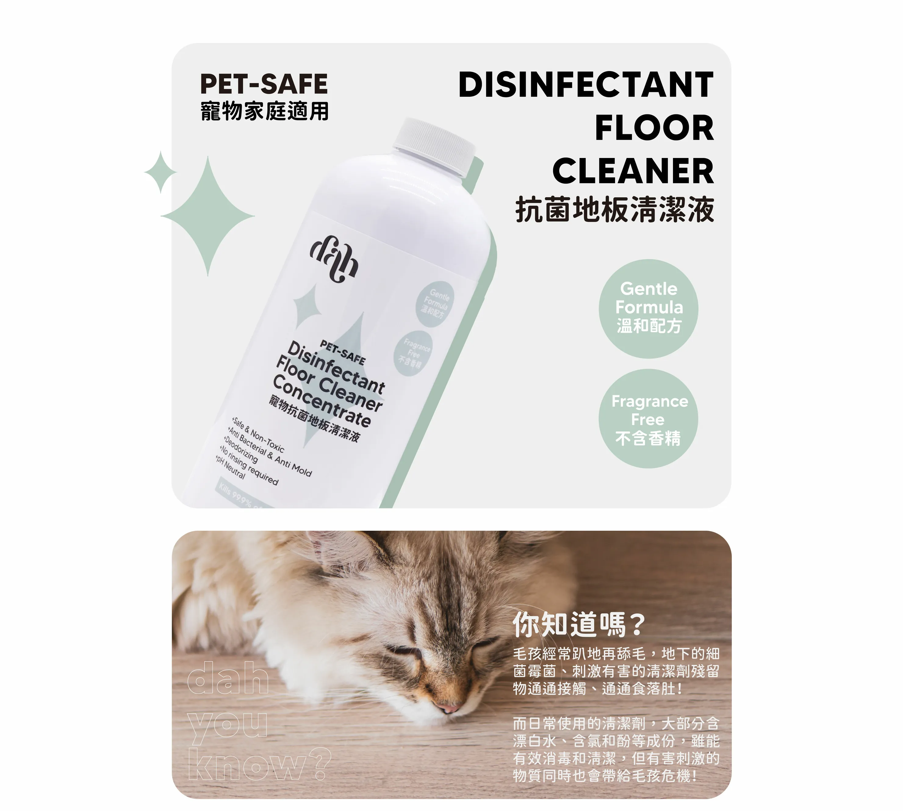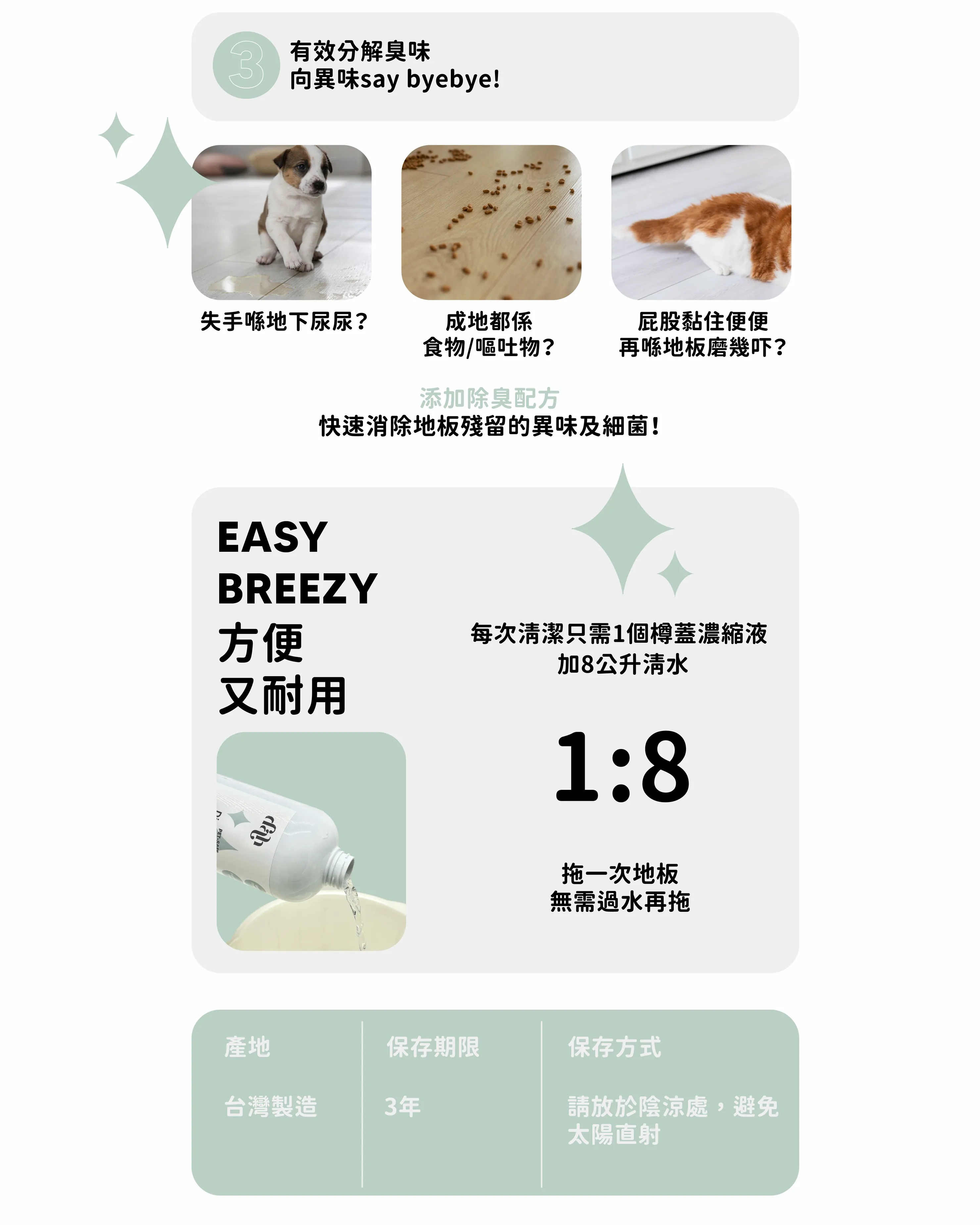 寵物抗菌地板清潔液使用方式 1樽蓋濃縮液+8公升清水,直接拖地。不需清水再拖過。 產品規格 重量:1000ml 主要成分: 純水、界面活性劑、抑菌劑(氯化苯二甲烴銨)、高分子吸收劑保質期: 3年製造日期如包裝所示產地:台灣