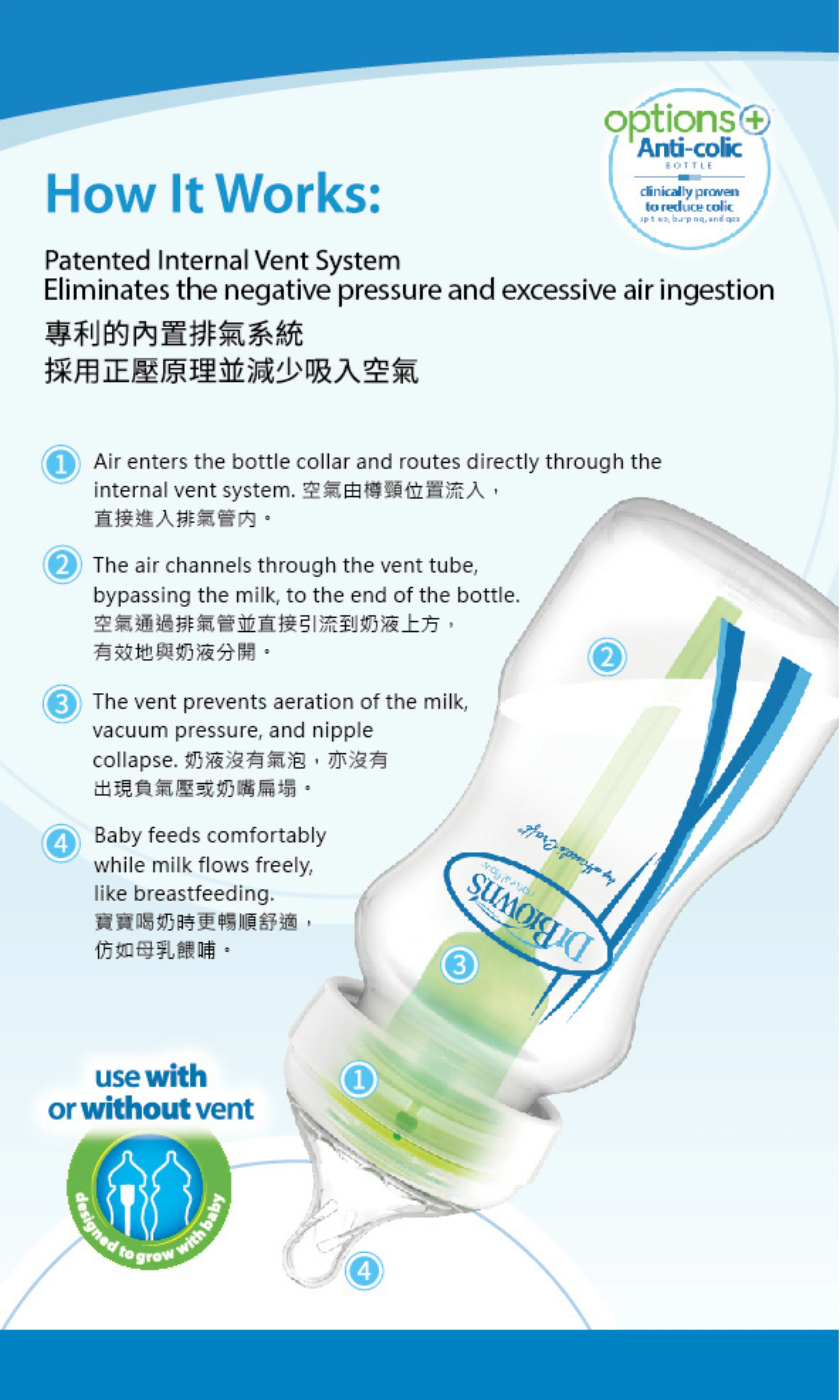 Dr Brown's Options+ 排氣奶樽系列,配備嶄新的仿母乳型奶咀,讓寶寶保持最自然而正確的吸吮。產品由專業醫護人員參與研發,近乎母乳的形狀及高質而柔軟的矽膠質料,帶來最舒適的餵哺體驗,並避免出現乳頭混淆。實驗證明,Dr Brown's 的完全排氣設計除有效減少肚風之外,亦保存奶液重要營養,同時能增強寶寶的消化和改善睡眠,其流速亦與母乳餵哺互相配合。而活動式的排氣管設計,讓父母可自由選擇安裝或移除排氣管,更具彈性。